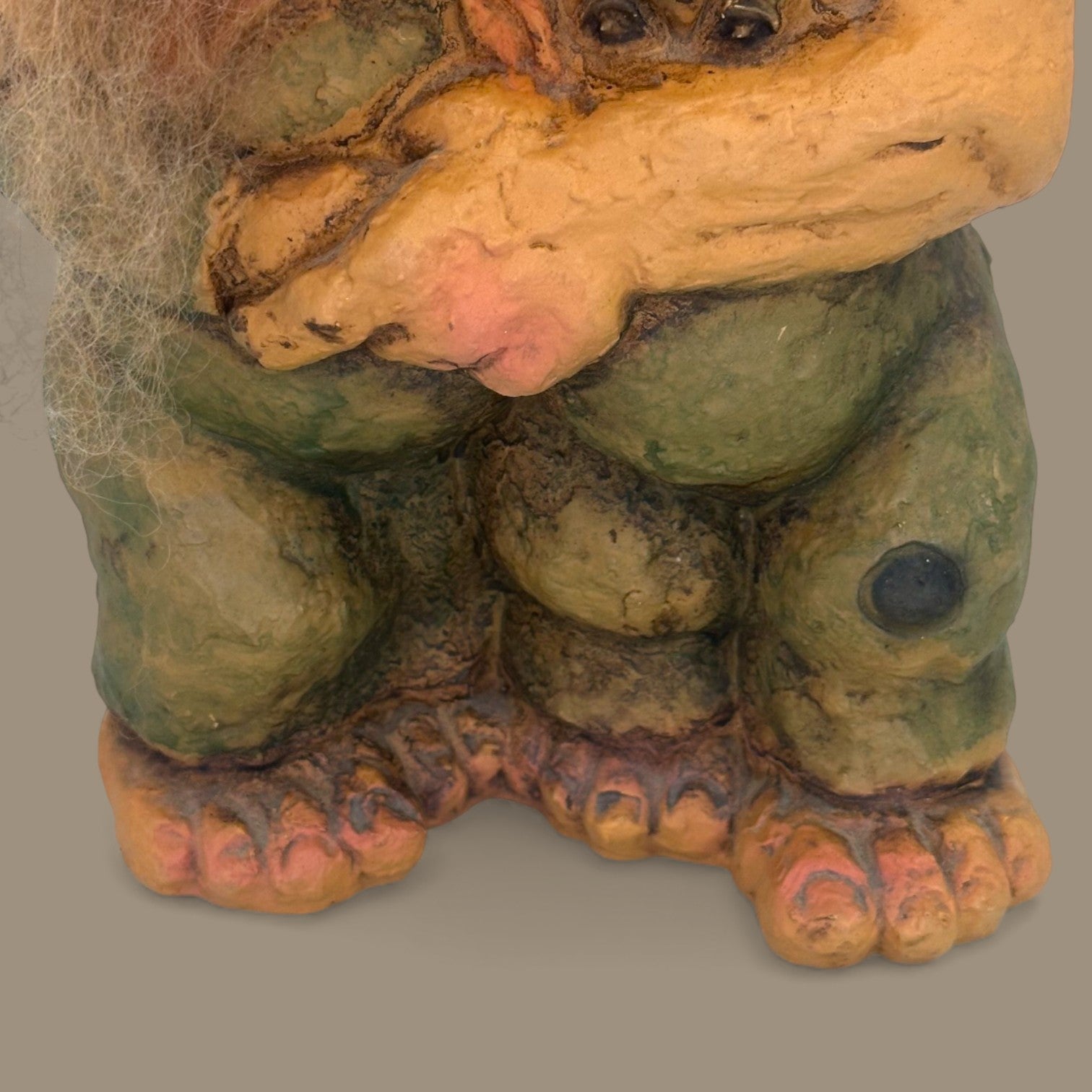 Get ready to bring some charming mischief into your home with this vintage hugging troll figurine! This collectible piece is a genuine Nyform Troll, handcrafted in Norway, likely from the 1980s or 1990s, and represents beautiful Scandinavian folk art. The sculpture is made of a cold cast resin or similar material, featuring rough, earthy textures and hand-painted colours in mottled greens, mustard yellow, and ruddy pink for the nose and toes. The large troll, complete with shaggy grey hair and an undeniable tail, is affectionately clutching a smaller, equally scruffy troll companion.