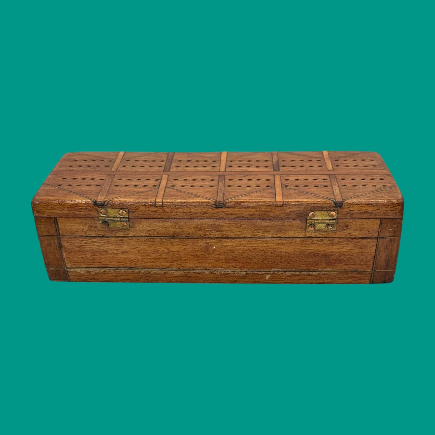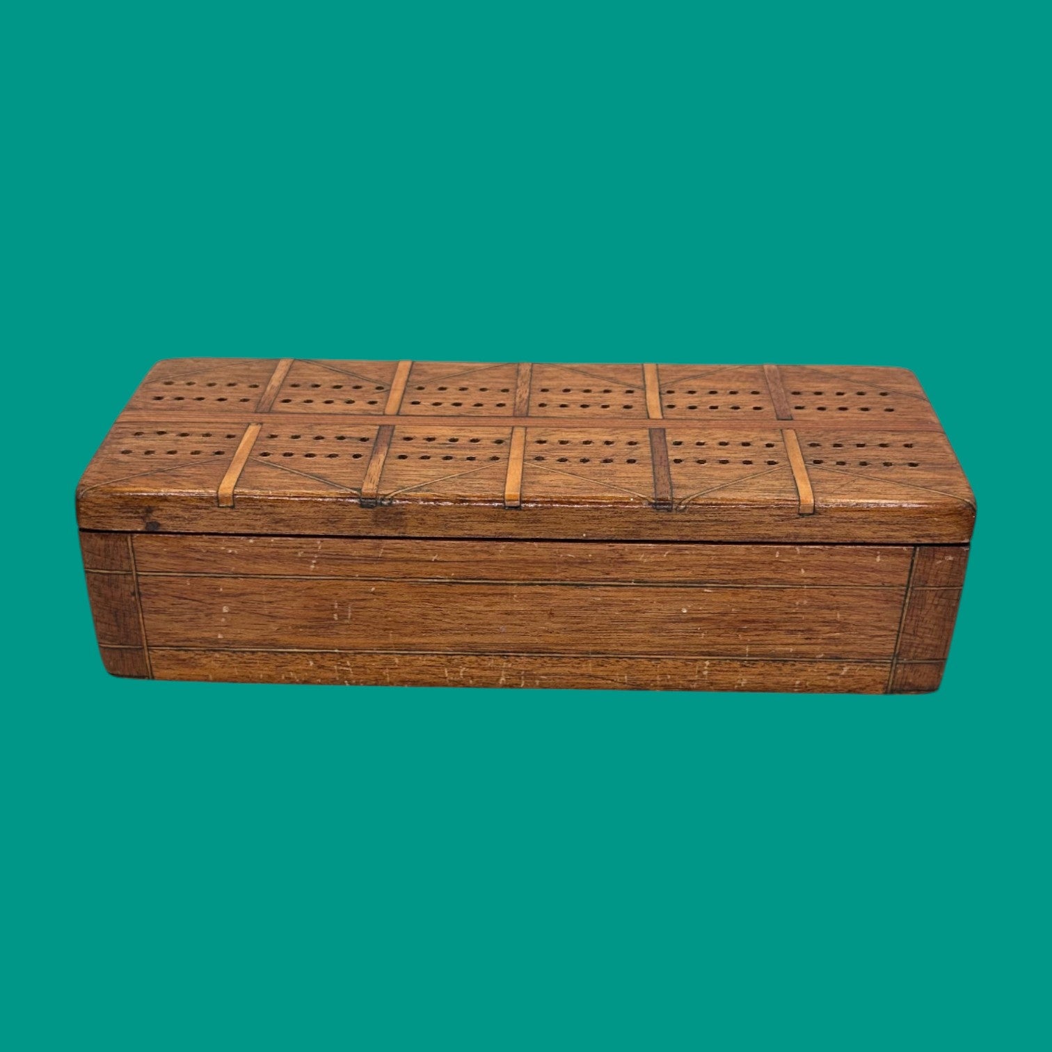 This vintage inlaid wooden crib board brings elegance to a classic pastime. Crafted from warm-toned wood with fine inlay detailing, it features a hidden compartment lined with soft green felt—perfect for storing cards and pegs. Both functional and decorative, this piece offers charm, character, and the joy of traditional gameplay in one refined design.