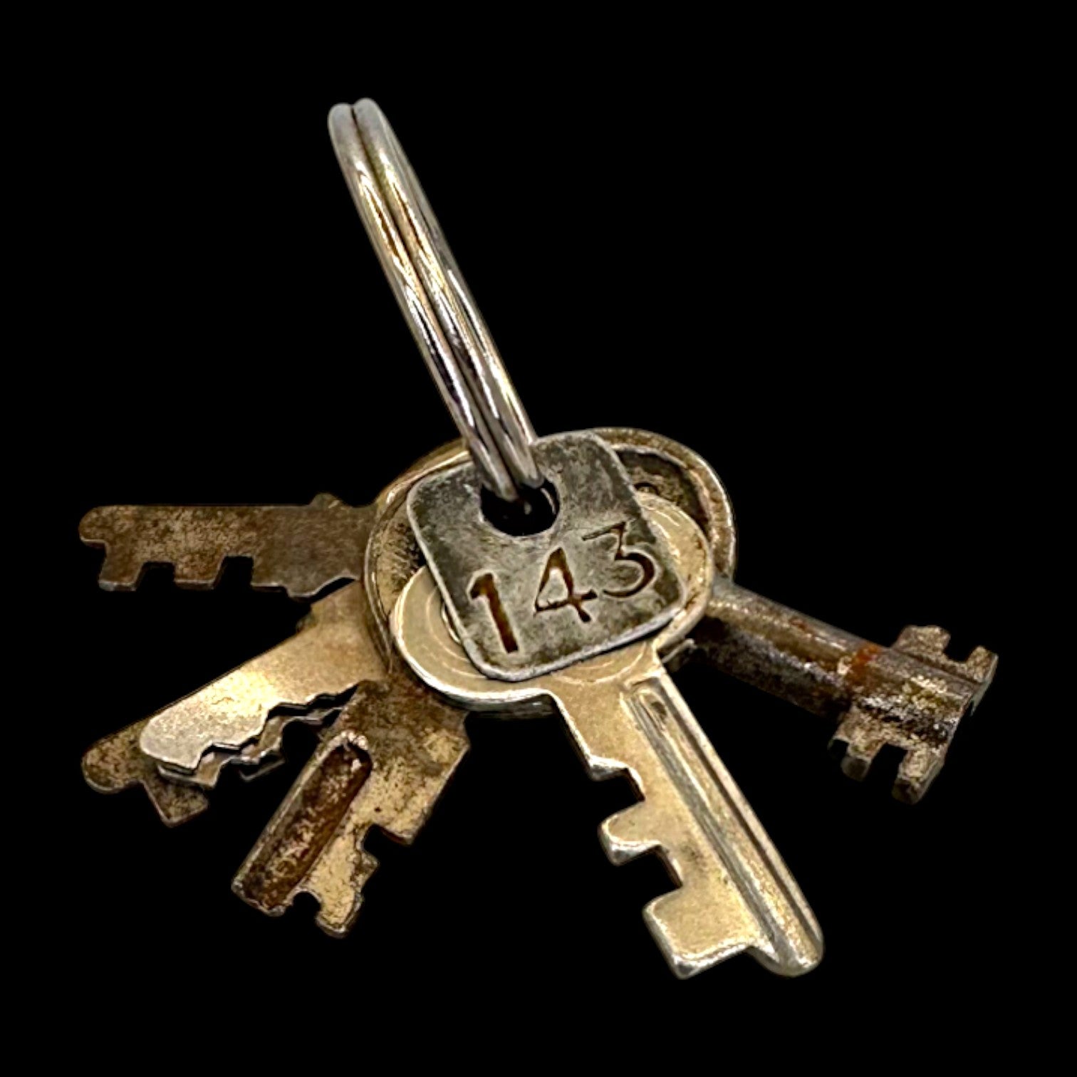This authentic set of vintage skeleton-style keys evokes a sense of mystery and nostalgia. Bound together on a sturdy metal ring, each key bears signs of age and use, telling its own story from a bygone era. The numbered #143 tag adds a unique touch of character, making this piece a perfect decorative accent or collectible for antique enthusiasts and designers alike.