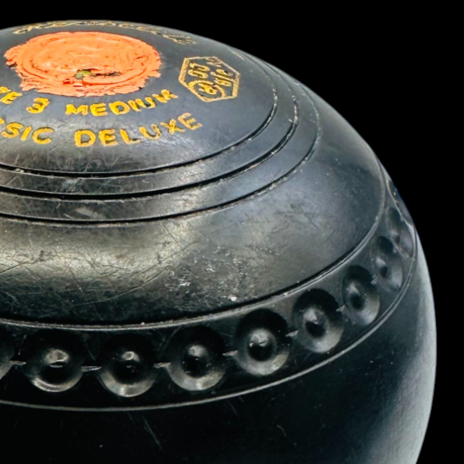 This vintage Henselite "Classic Deluxe" Size 3 Medium lawn bowl embodies the heritage of one of the most respected brands in the sport. Made with precision and durability, Henselite bowls are trusted worldwide for their consistent performance and iconic design. The deep black finish with gold detailing and the distinctive grip pattern makes this a collectible piece for players and enthusiasts alike. Perfect for use on the green or as a vintage sports display item.