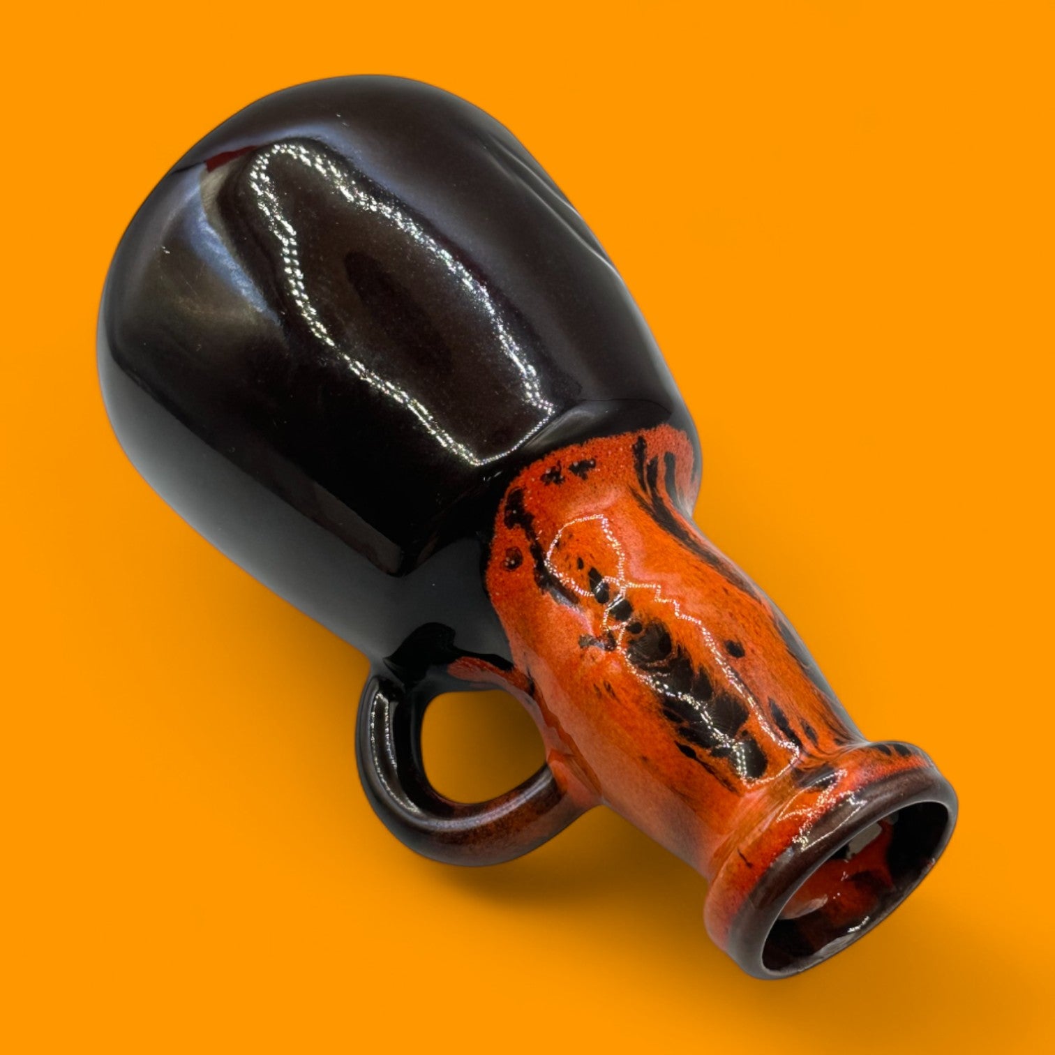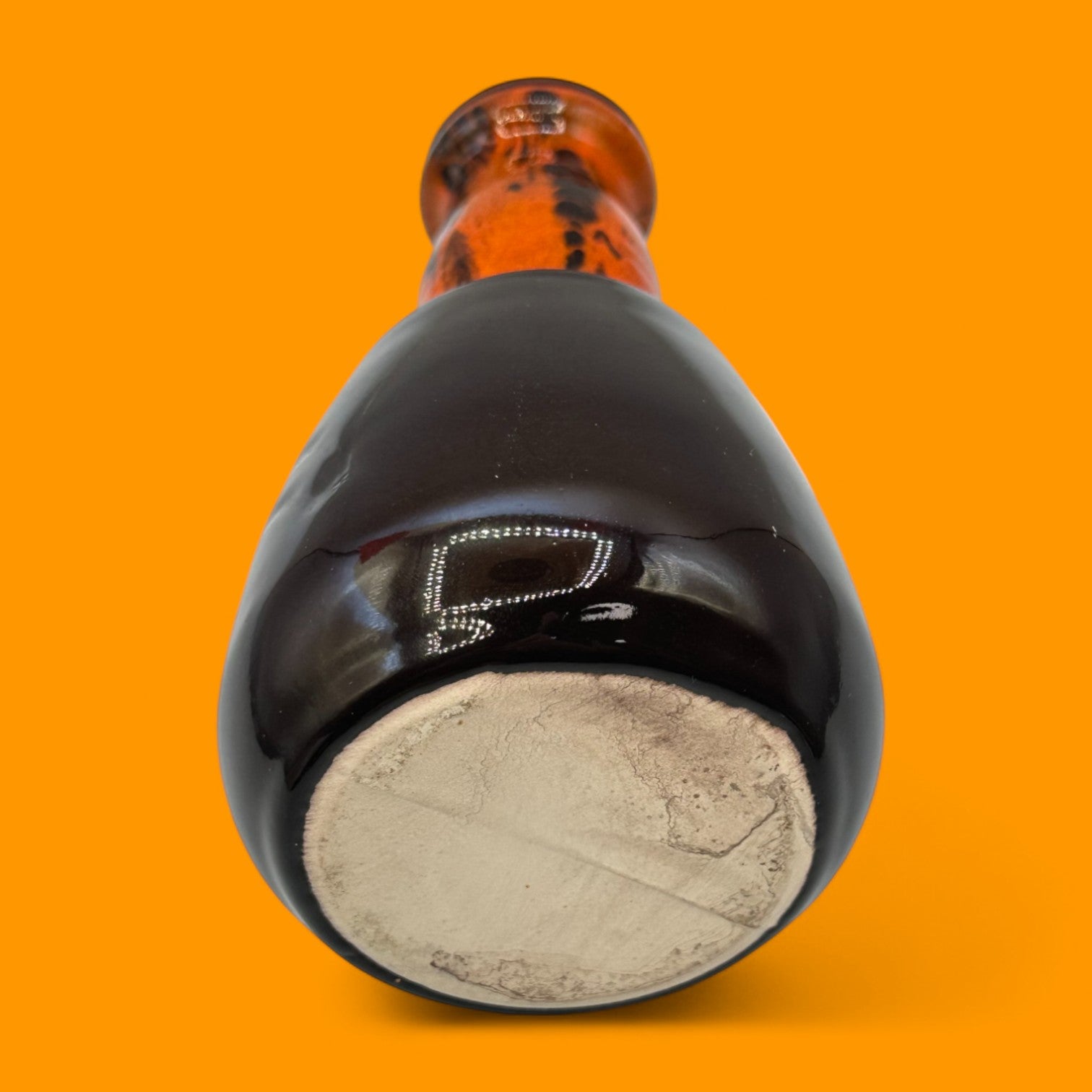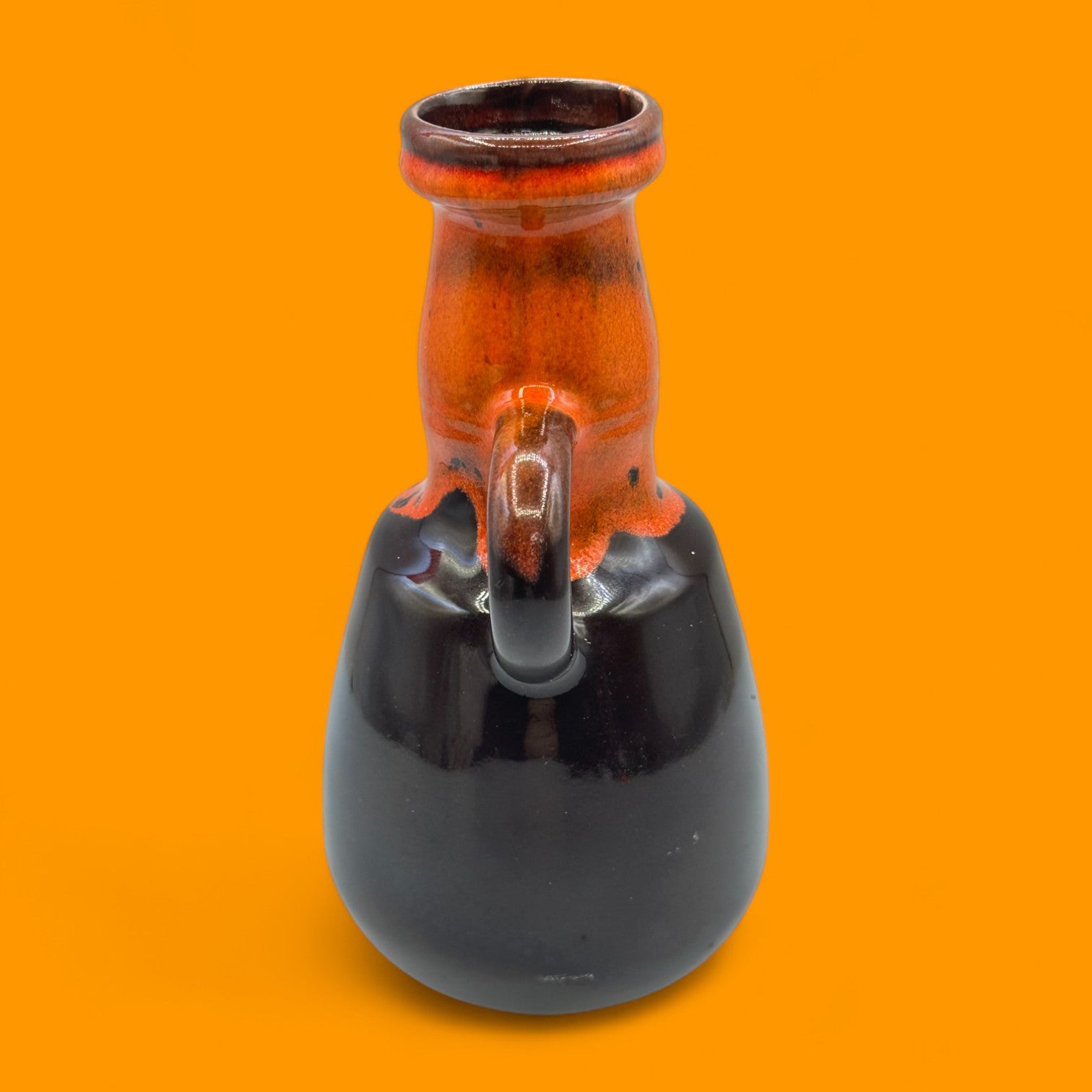 This vintage midcentury modern vase captures the essence of 1960s–70s design with its striking orange drip glaze cascading into deep brown tones. Handmade with care, its tall and slim profile paired with a rounded base makes it a standout decorative piece. Whether placed on a shelf, mantle, or dining table, this piece brings warmth and personality to any space. Its unique glaze pattern ensures no two vases are exactly alike, making it both a collectible and a statement item.