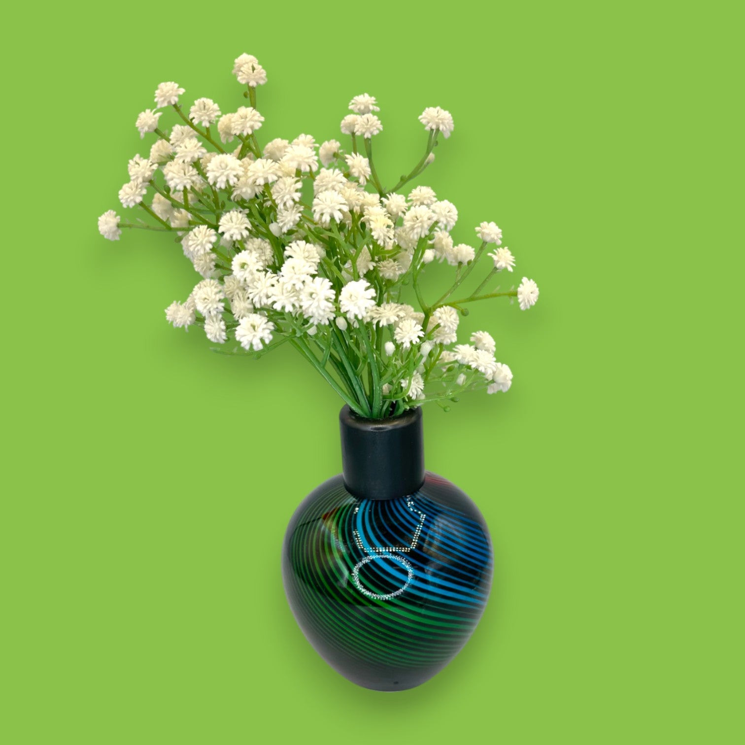 This vintage Murano glass vase showcases the elegance of Italian artistry with its striking swirl pattern in green, blue, and red set against deep black glass. The bold colors and glossy finish create a mesmerizing effect, while the sturdy form makes it both decorative and functional. A true collector’s piece, perfect for displaying flowers or standing alone as an art object.