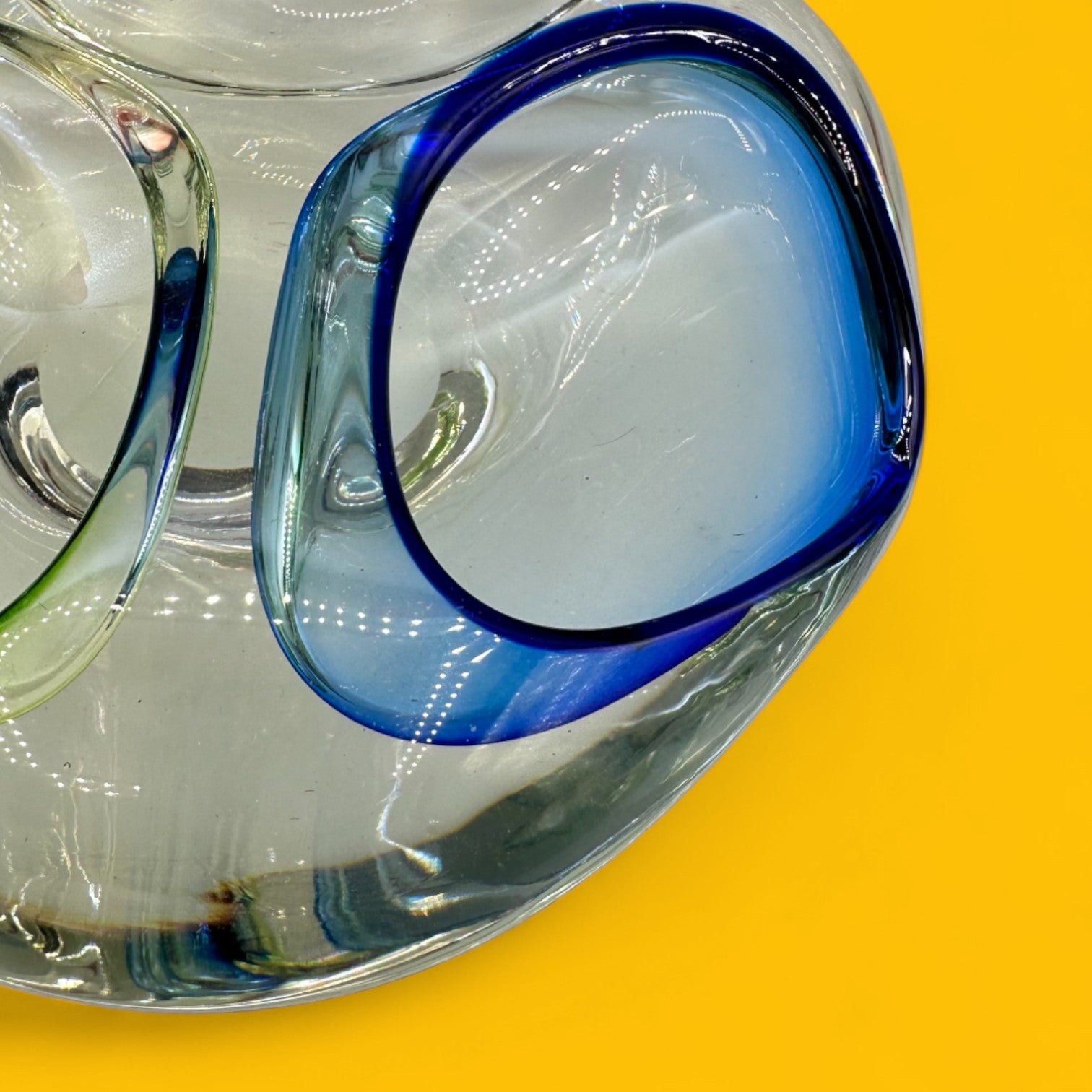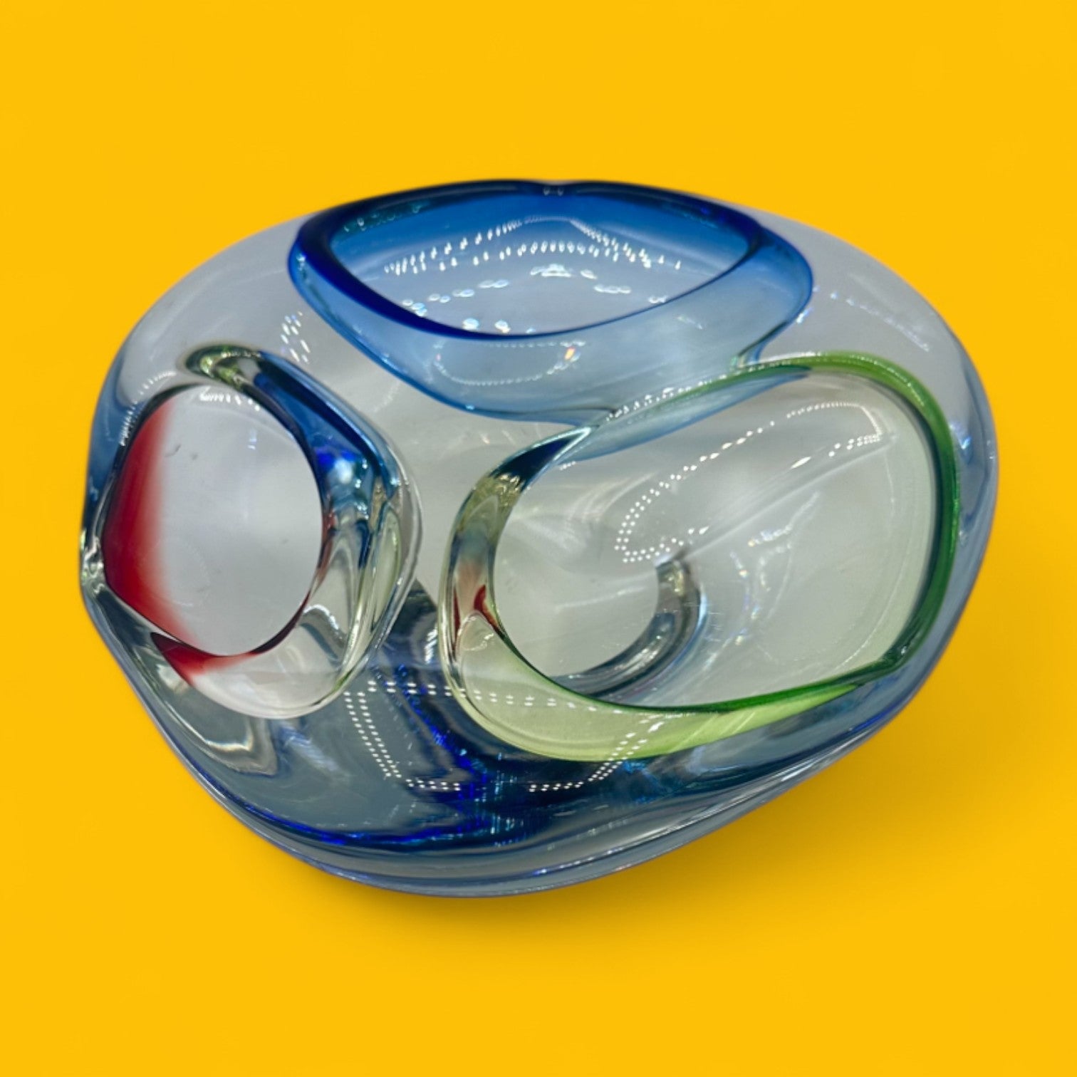 This vintage Murano art glass dish embodies the elegance of mid-century modern design. Handcrafted with the renowned sommerso technique, it features bold encased colors of cobalt blue, lime green, and deep red within thick, clear glass. With its free-form amoeba-like shape and three distinct indentations, this piece serves as both functional decor and sculptural art.