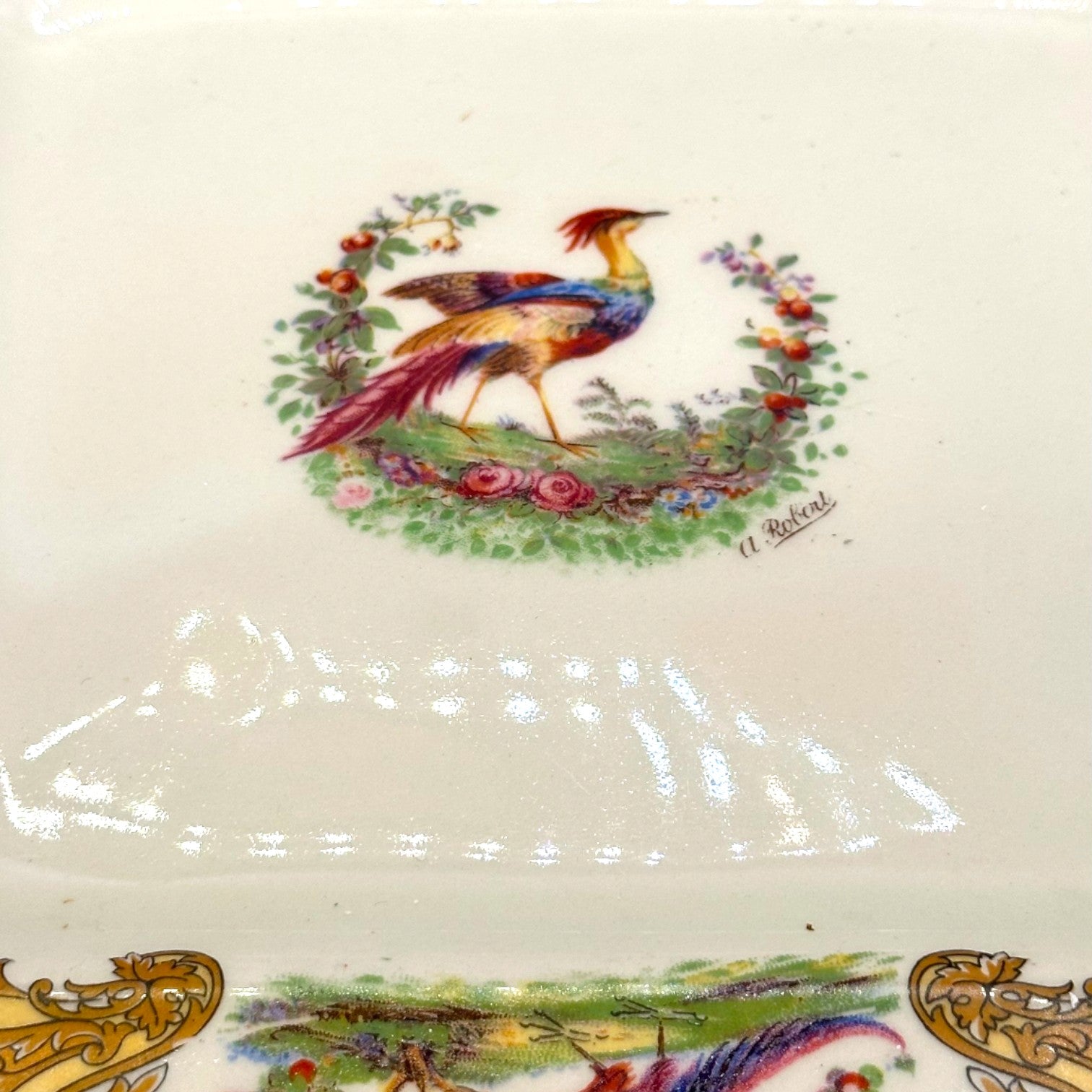This vintage Myott Royal Crown Staffordshire plate showcases the beloved “Chelsea Bird” pattern, a richly coloured design celebrated for its elegance and historical character. The central exotic bird motif, signed by artist A. Robert, is framed by ornate cartouches and warm reddish-orange bordered panels, creating a refined and painterly composition. Crafted in Staffordshire, England, this piece is a beautiful example of early-to-mid 20th-century English ceramics. Its square shape, intricate detailing, and delicate gold accents make it a standout display piece for collectors and décor lovers alike. Whether used as a serving plate or kept as an artistic accent, it reflects the enduring beauty of traditional English pottery.