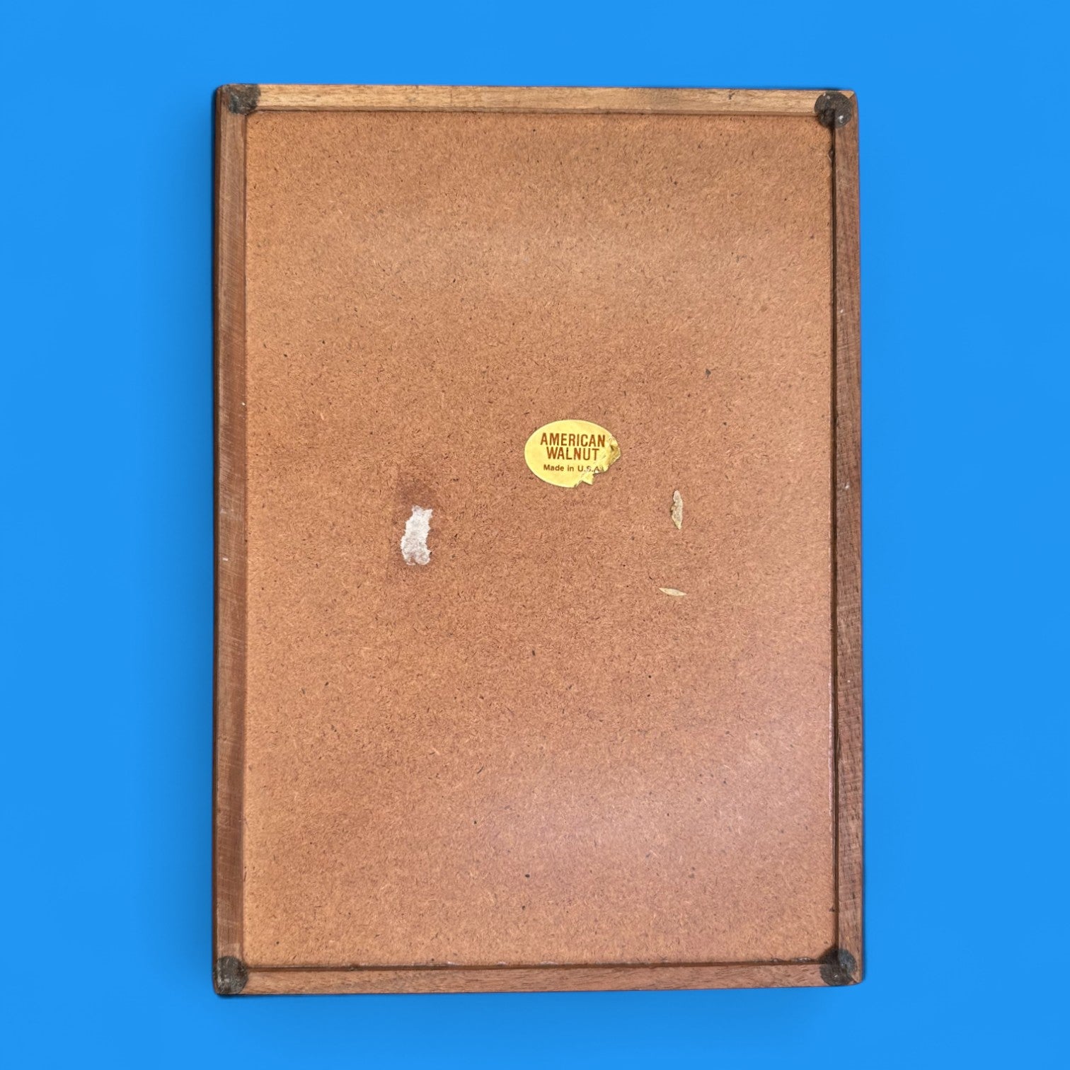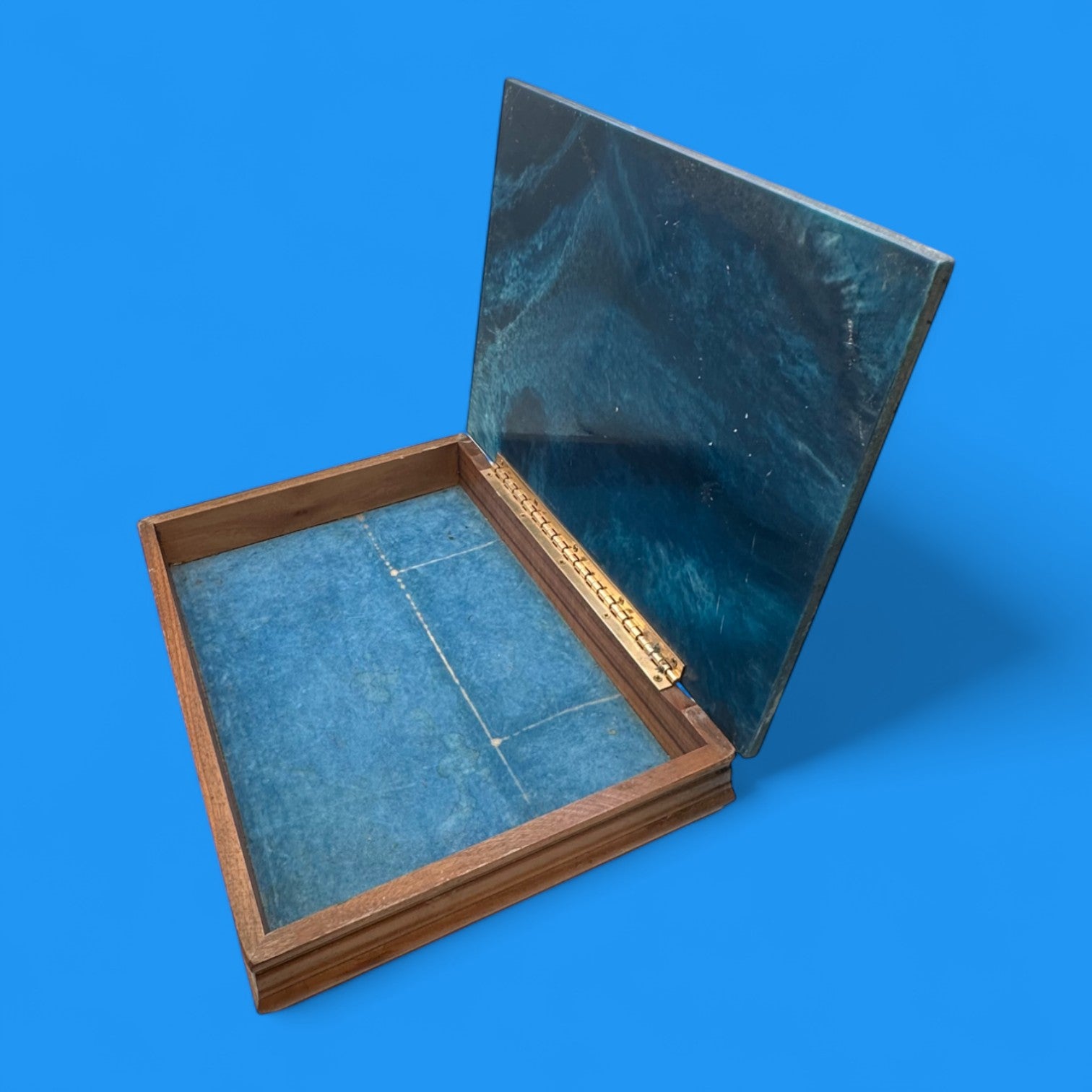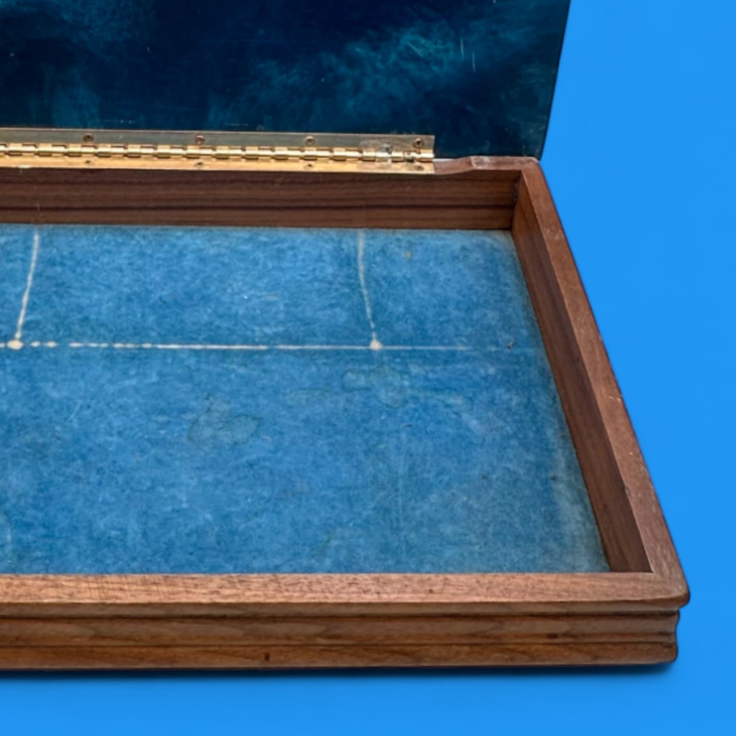 This vintage nautical trinket box captures the spirit of the sea with its incolay stone lid featuring a finely detailed sailing ship in relief. Perfect for storing cufflinks, jewelry, or keepsakes, this mid-century piece combines maritime charm with functional elegance. Its rich blue tones and sturdy wooden base make it both a decorative accent and a practical storage solution.