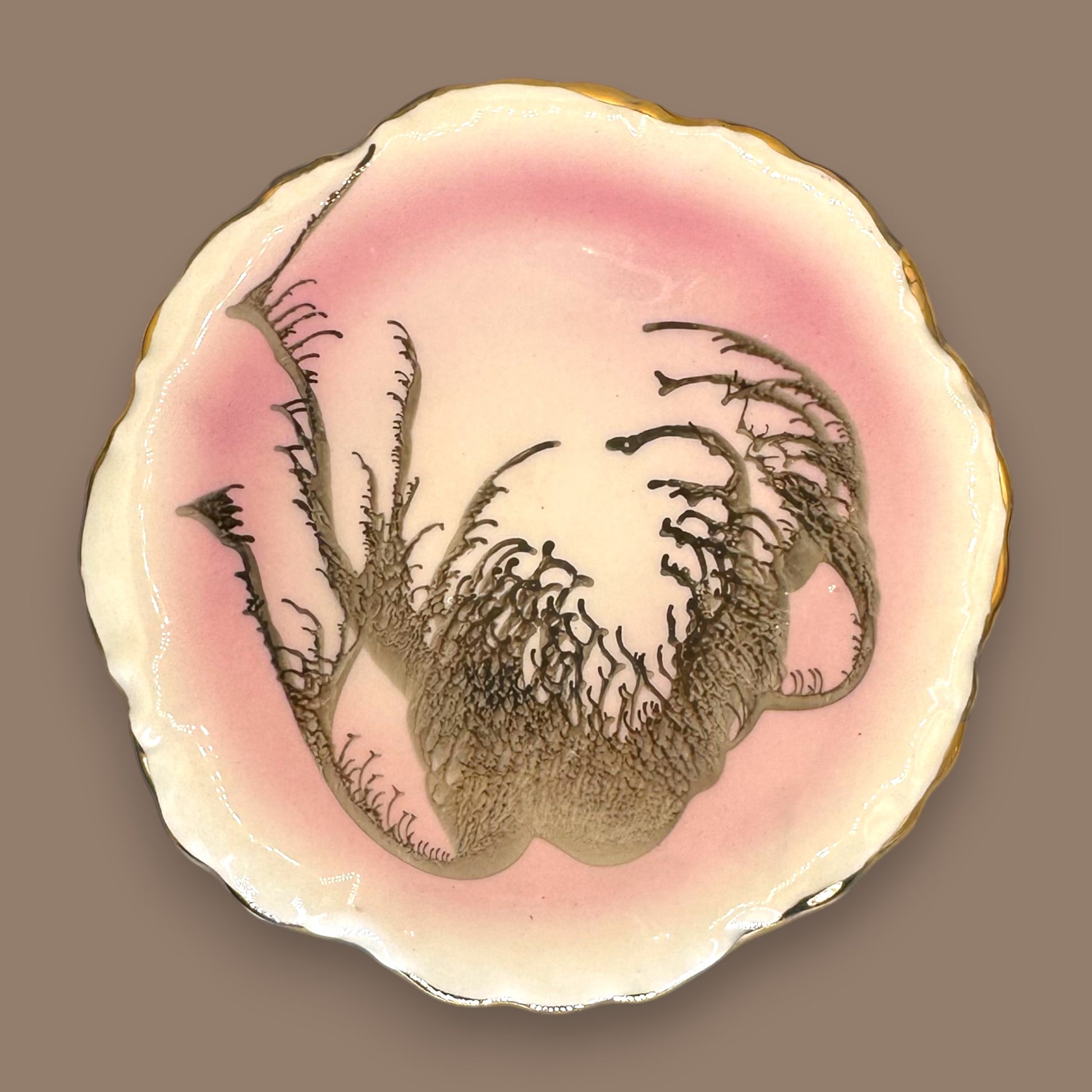 Vintage Scalloped Pink Dish with Gold Trim – Abstract Black & Grey Design
