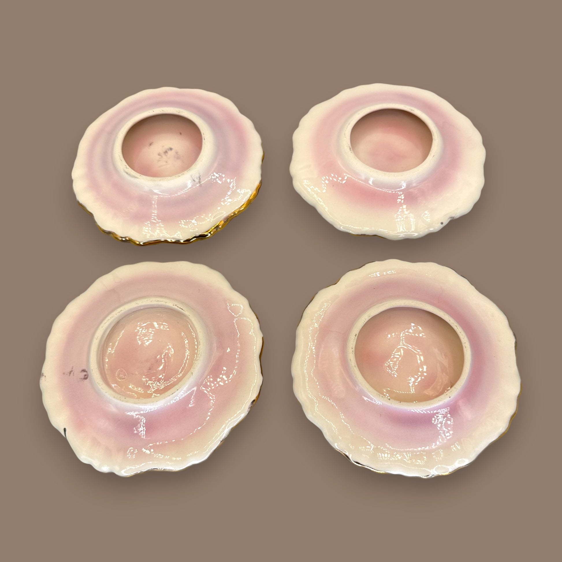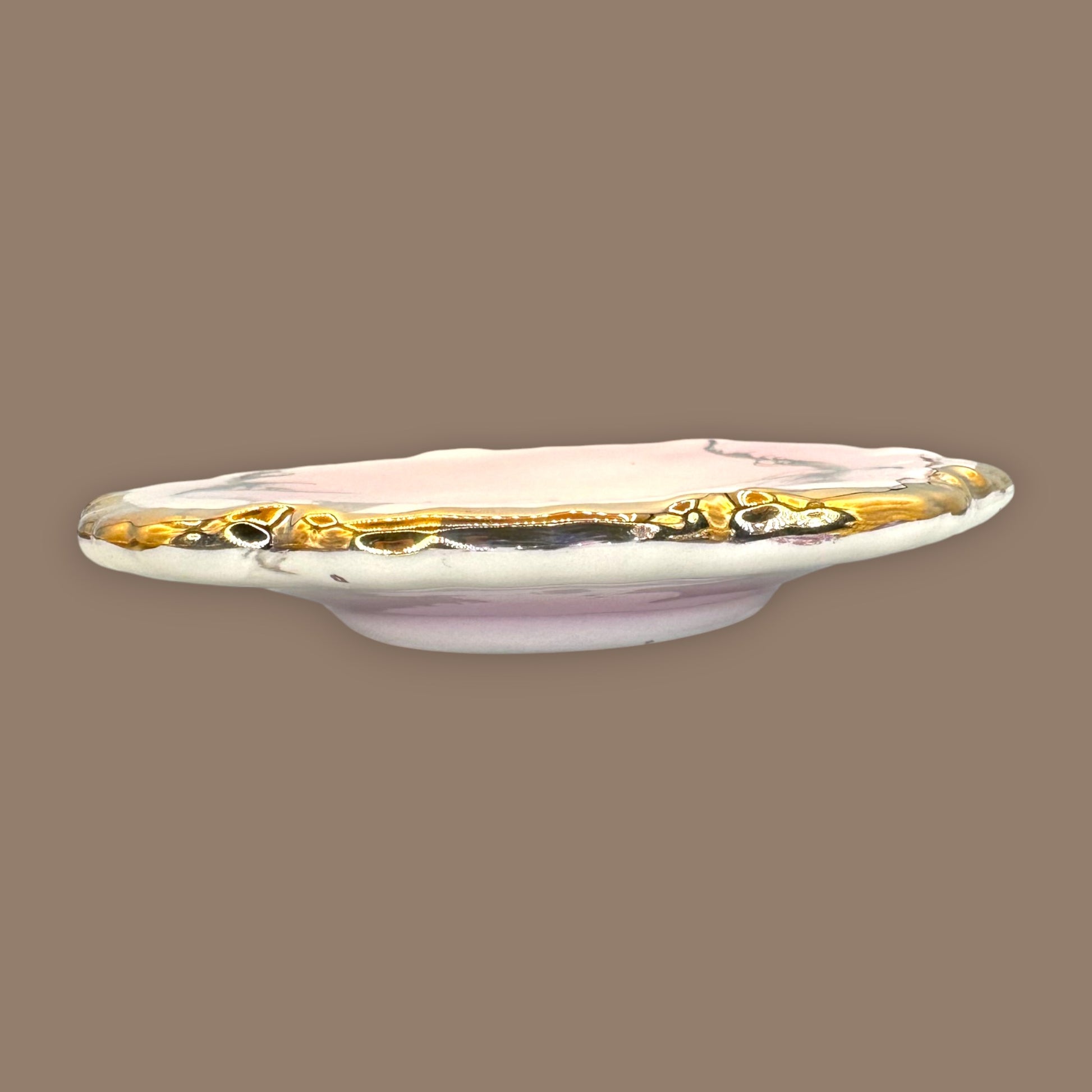 This Vintage Scalloped Pink Dish captures timeless femininity with its soft pastel tones and hand-painted abstract black and grey pattern. The wavy scalloped edges are highlighted with delicate gold trim, making each dish a unique work of art. Perfect for collectors, or as elegant trinket or ring dishes.