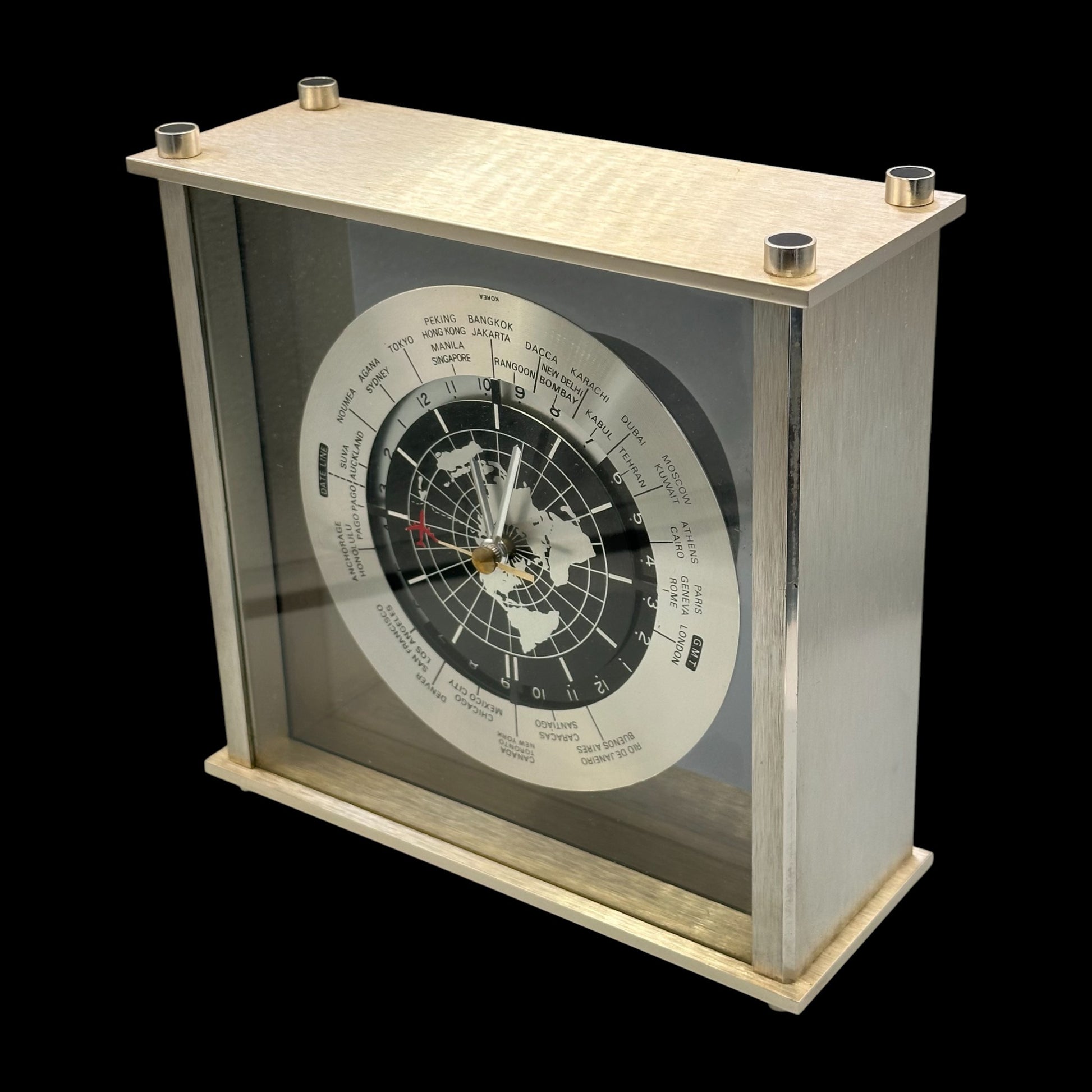 This Vintage Seiko Quartz World Time Zone Clock showcases Seiko’s legendary craftsmanship and international flair. Designed for travelers and collectors alike, it features a detailed world map face encased in brushed metal and glass. The charming red airplane second hand adds a touch of aviation nostalgia, symbolizing the spirit of global exploration.