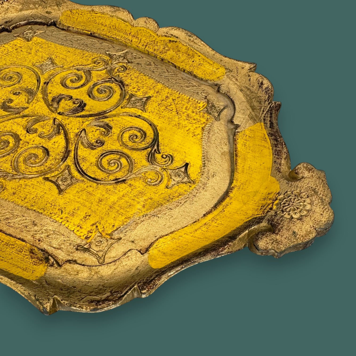 This exquisite Florentine serving tray brings the charm of old-world craftsmanship to modern interiors. Hand-painted in radiant shades of antique gold and rich yellow, it features intricate scrollwork and a scalloped edge design that evokes the luxury of mid-century Italian décor. Perfect for both display and function, this vintage piece adds sophistication to coffee tables, vanities, or festive gatherings.