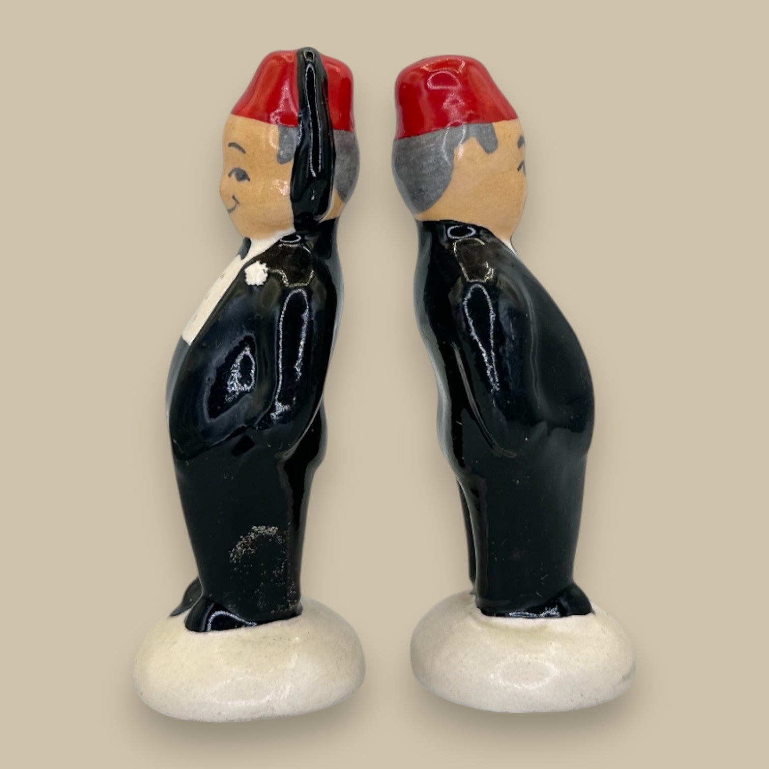 These adorable and rare vintage ceramic salt and pepper shakers feature two dapper Shriners gentlemen dressed in black tuxedos with white shirts and bow ties, topped with bright red Fez hats. Their cheeky, hand-painted faces suggest a playful 1940s-1950s North American origin. The glossy, black glaze contrasts sharply with the white details and red headwear, standing on a round, unglazed white base.
