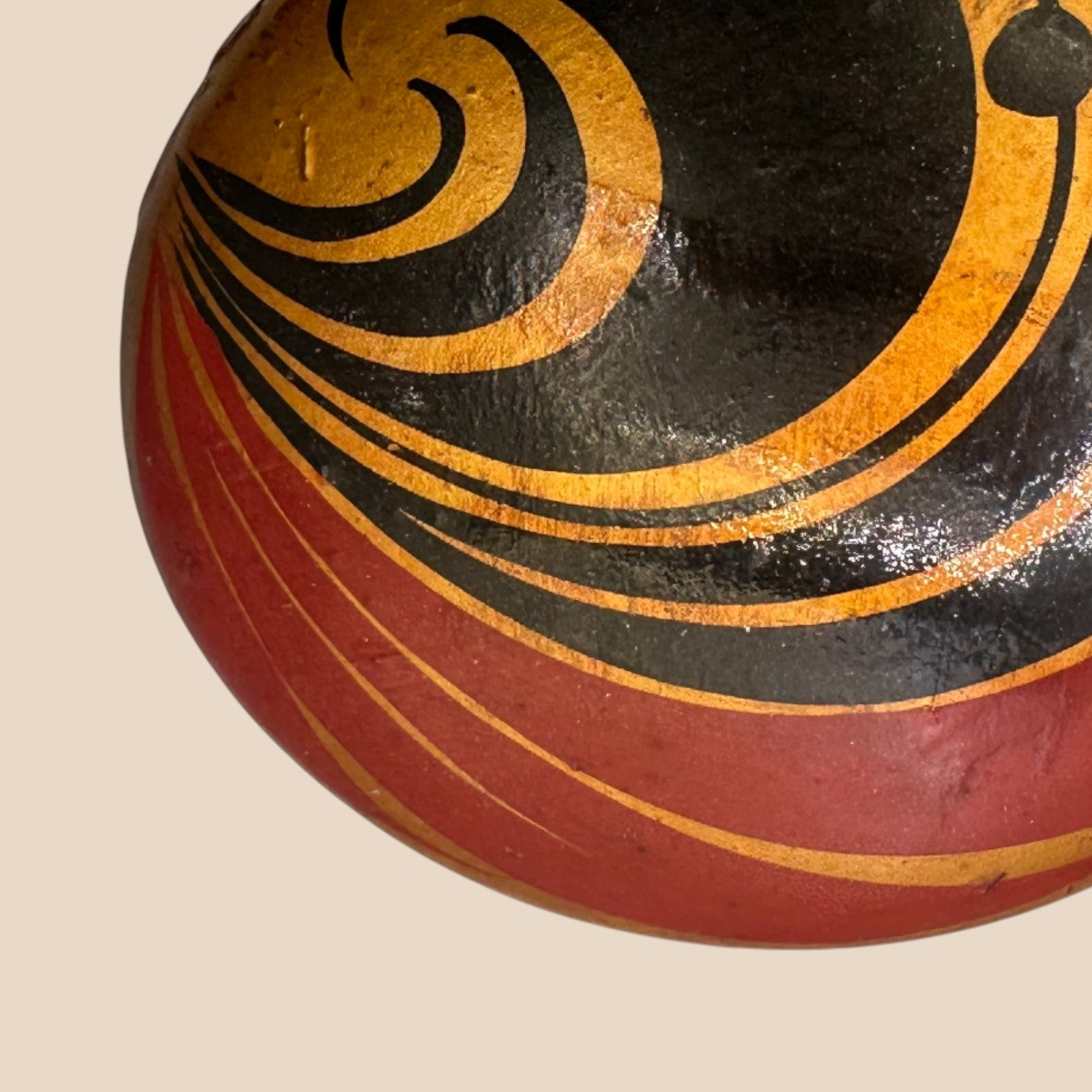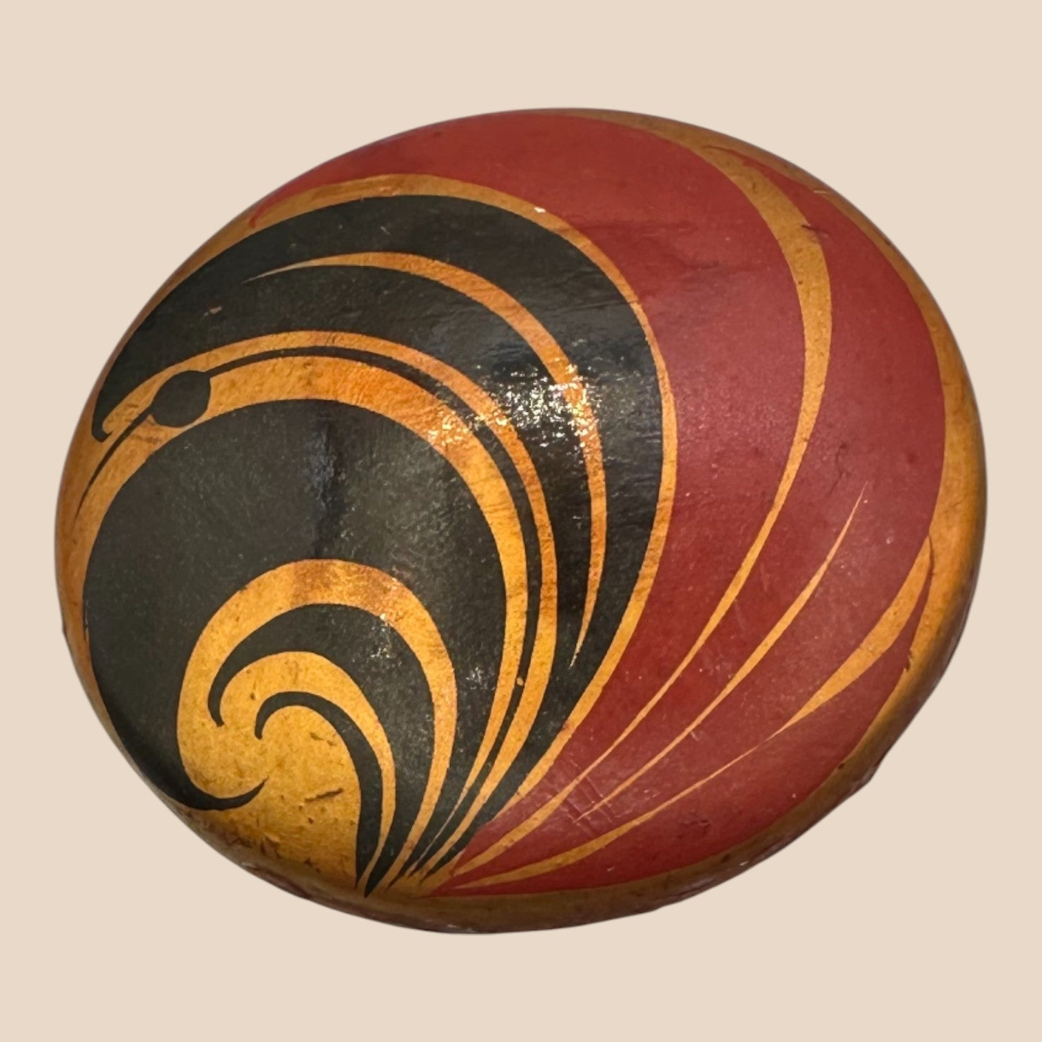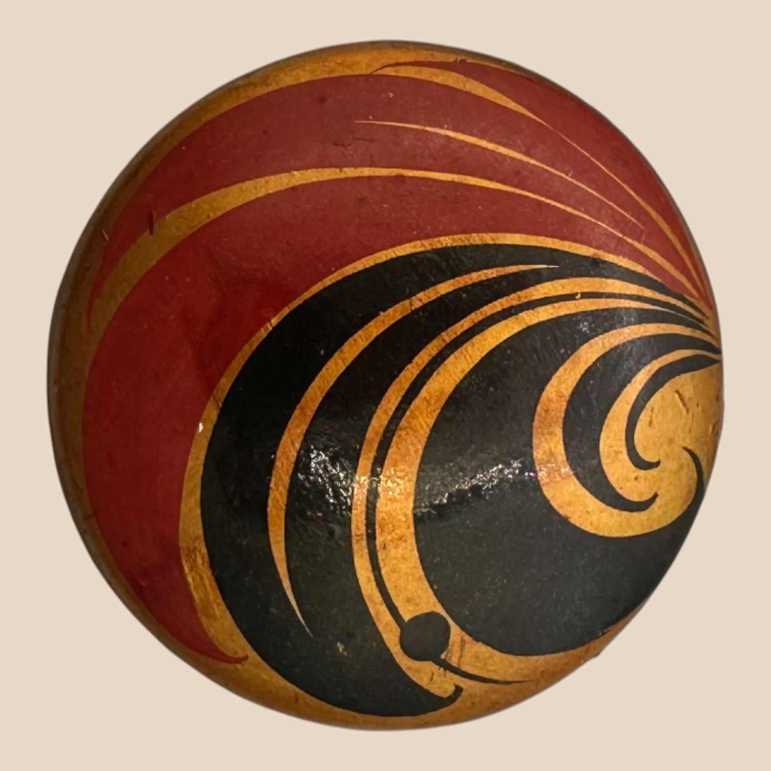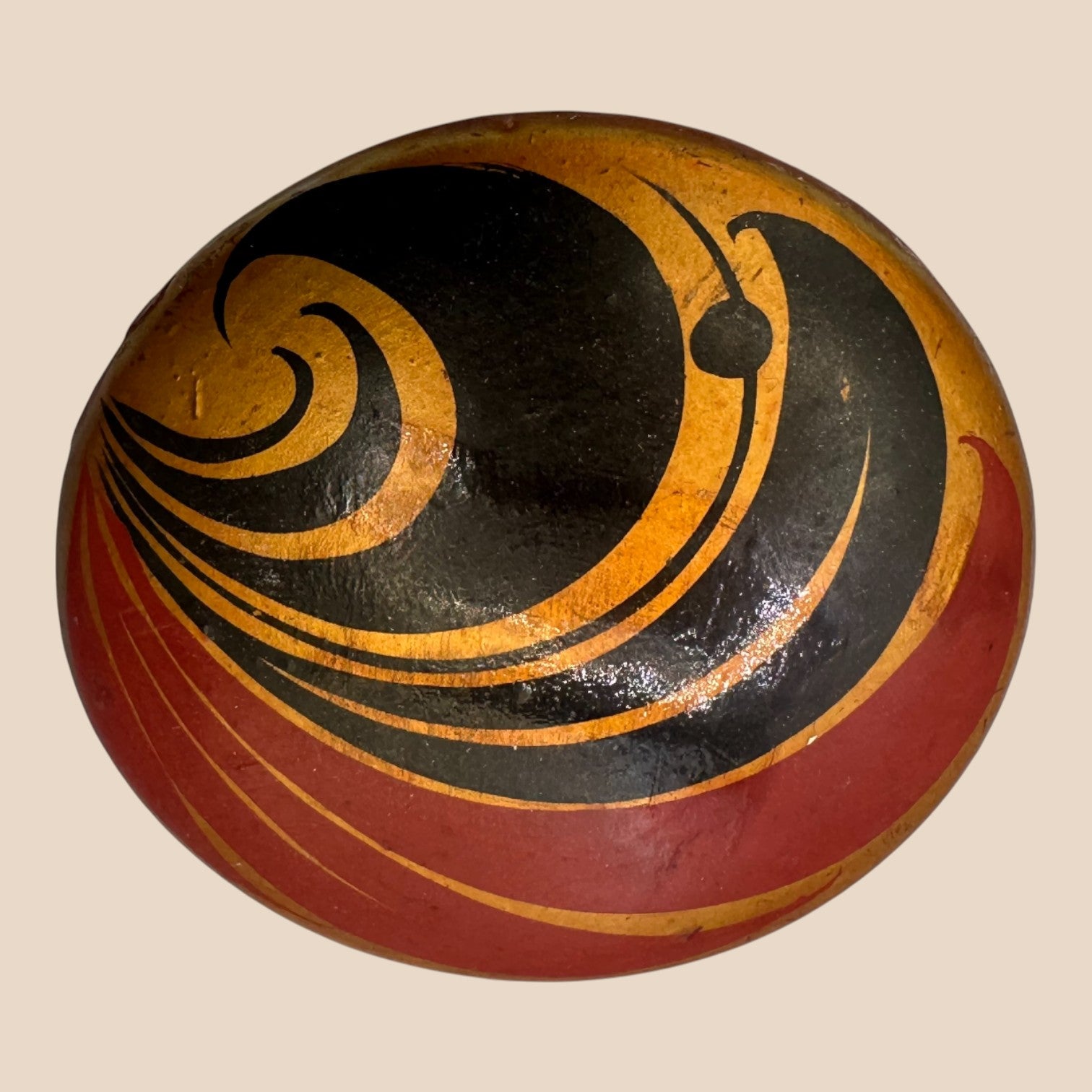 This authentic vintage pinback features a dynamic geometric swirl design in deep red, black, and gold tones, reflecting the strong visual language of 1960s Soviet decorative art. Crafted with a solid metal base and enamel-style finish, it showcases the era’s focus on symbolism, movement, and form. Marked “Made in USSR” on the reverse, this piece carries genuine historical character and age-consistent wear. A compelling collectible that bridges political history and graphic design.