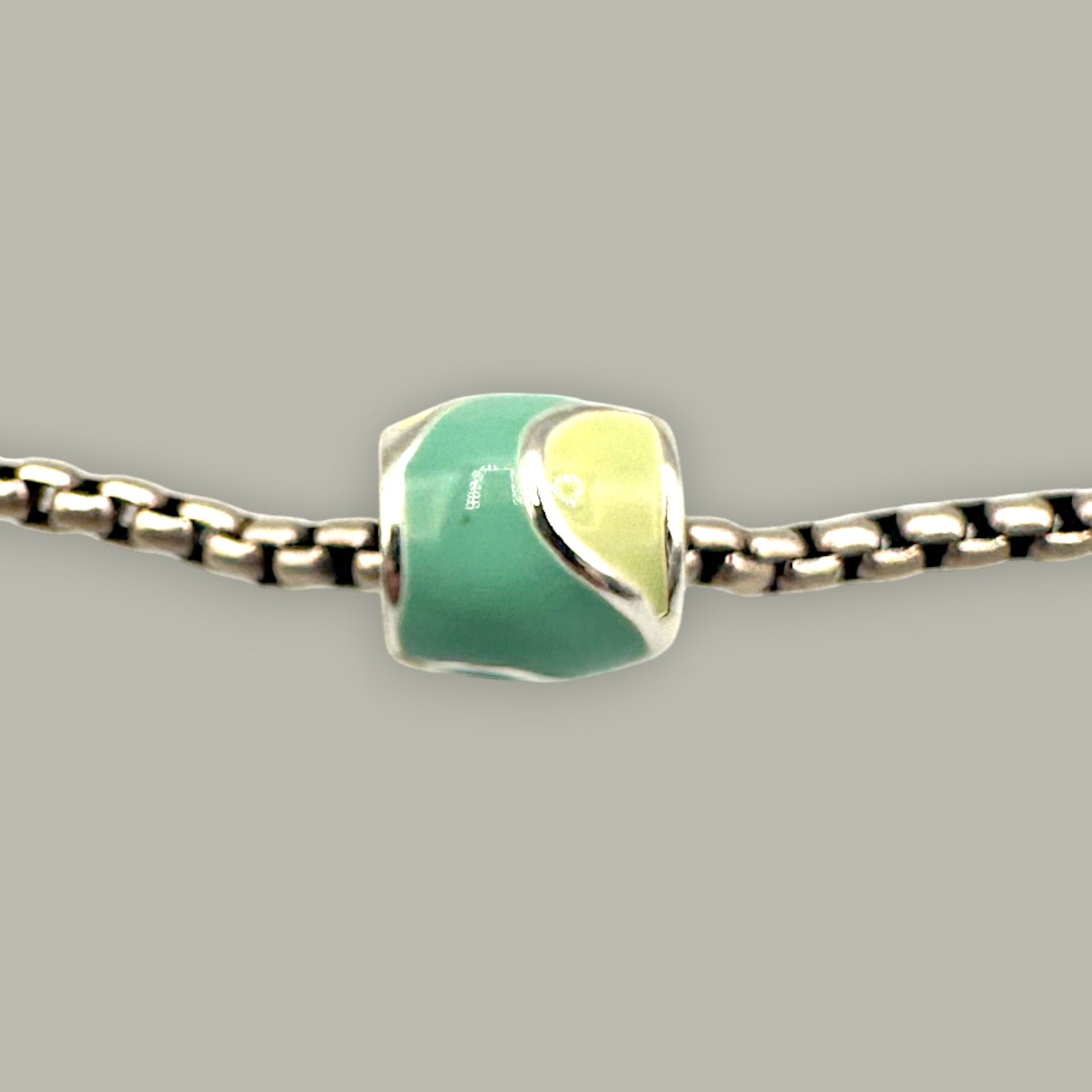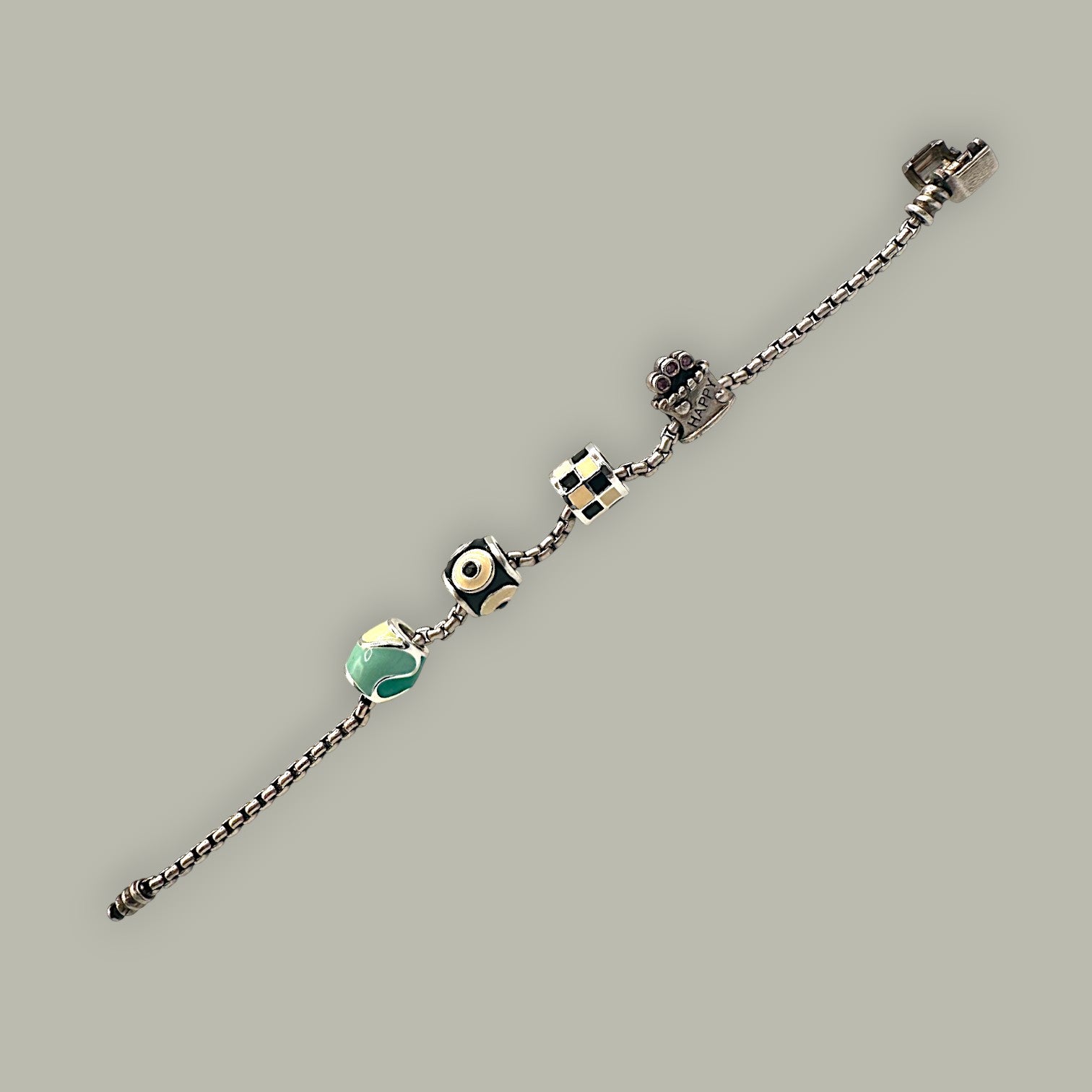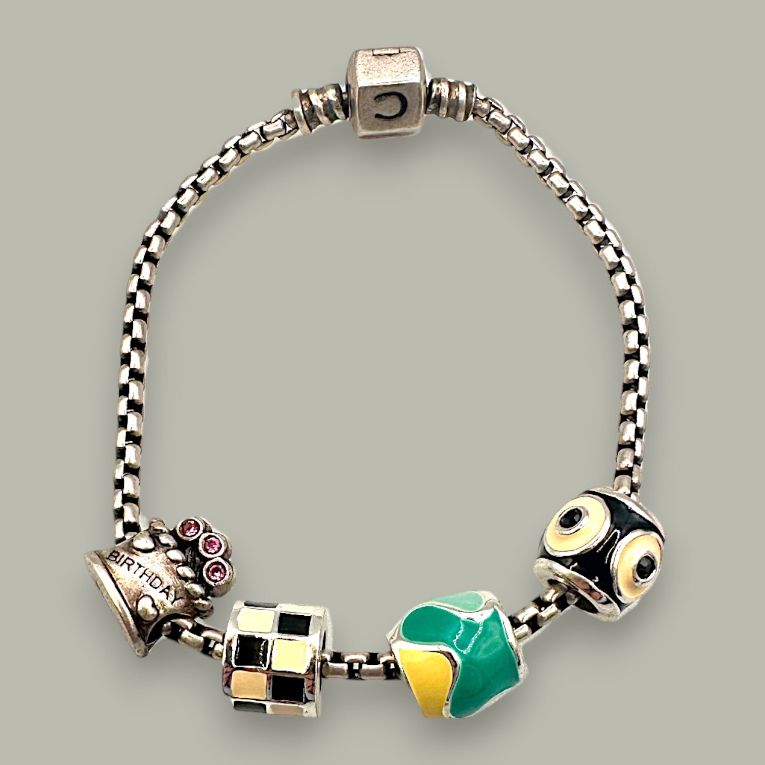 This vintage Chamilia sterling silver charm bracelet is a beautifully curated piece that tells a story through symbolic and decorative charms. Crafted in solid 925 sterling silver, it features a classic box chain design with a secure clasp and a harmonious mix of enamel, glass, and crystal accents. Each charm adds character, blending sentiment, protection, and artistic detail. A timeless bracelet designed to be worn, cherished, and remembered.