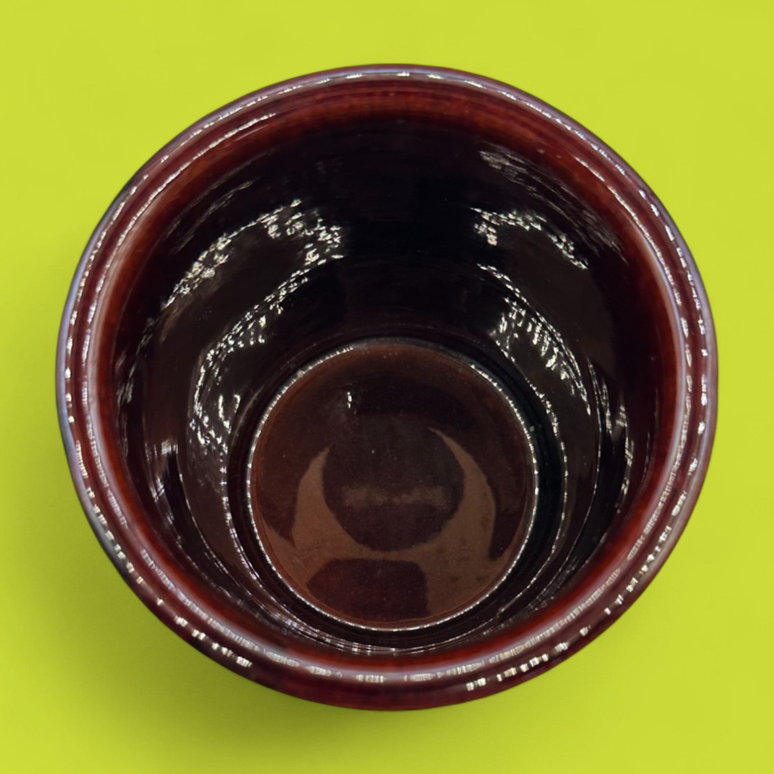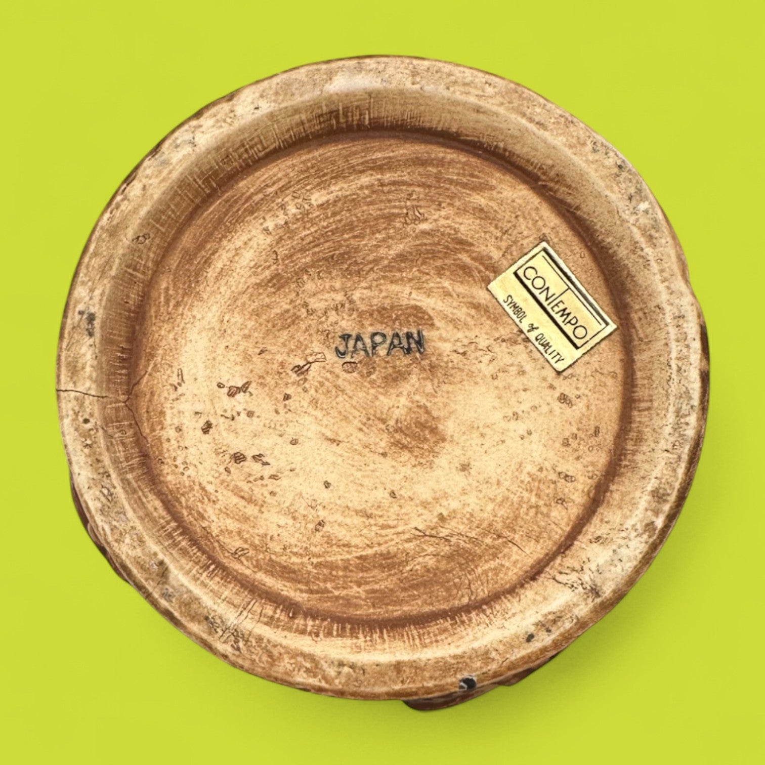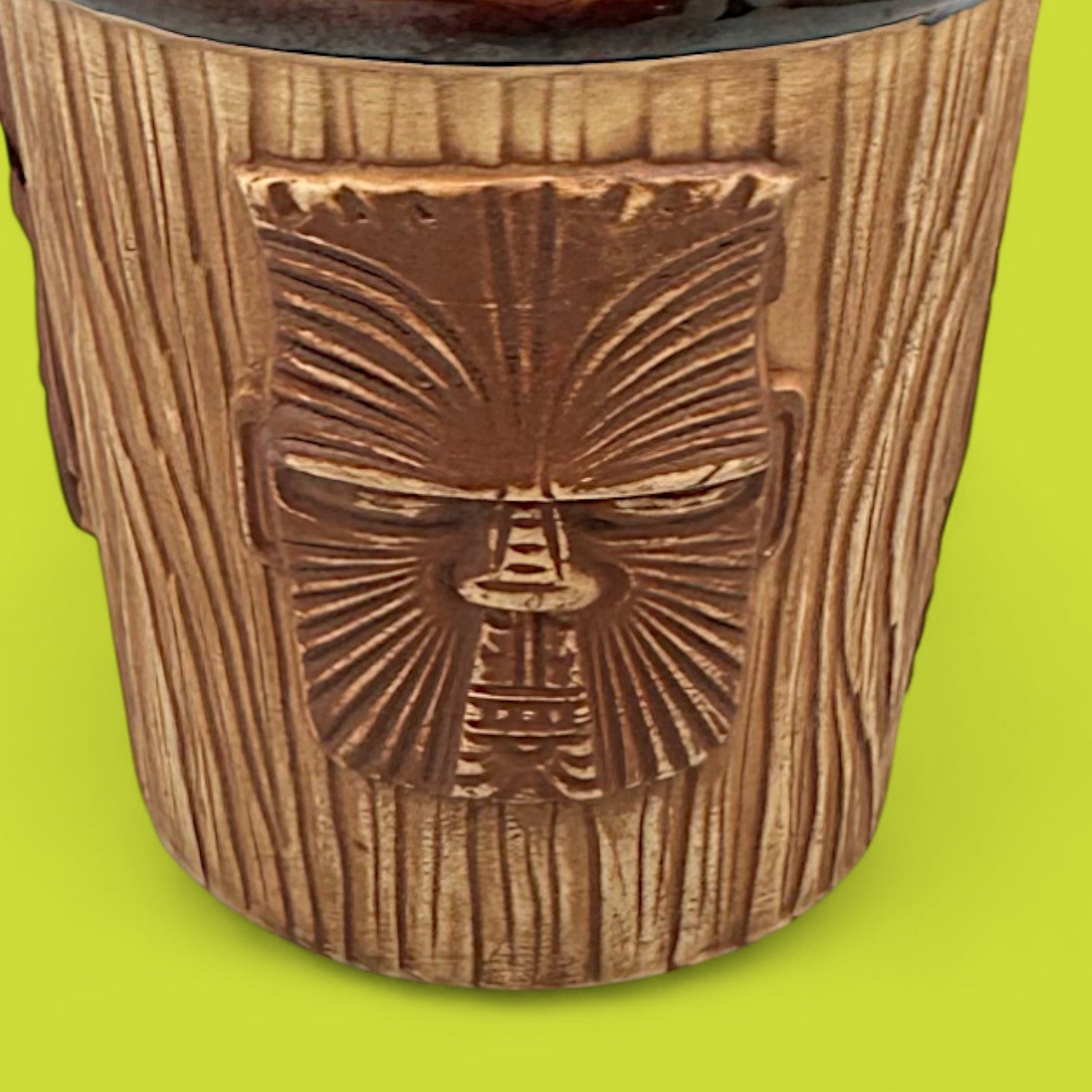 This vintage ceramic planter pot captures the spirit of mid-century tiki culture with bold carved face designs around its body. Finished in rich brown tones with a glossy interior, it’s perfect as a planter, vase, or decorative accent. Standing 4.25" tall, it brings a playful Hawaiian-inspired vibe to any home, bar, or garden décor. Made in Japan by Contempo, known for quality craftsmanship.