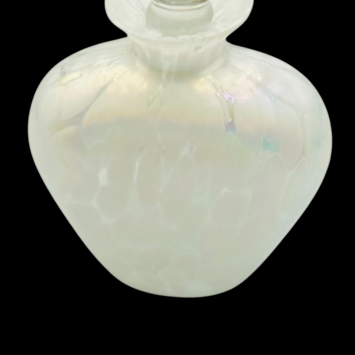 This Silvestri white iridescent perfume bottle shimmers with a pearlescent glow, reflecting subtle opalescent tones of light. Crafted in an Art Deco-inspired style, it carries both vintage charm and collectible value. The ornate stopper completes its sophisticated silhouette, making it a decorative piece as much as a functional one. A treasure for collectors or a unique gift for someone special.