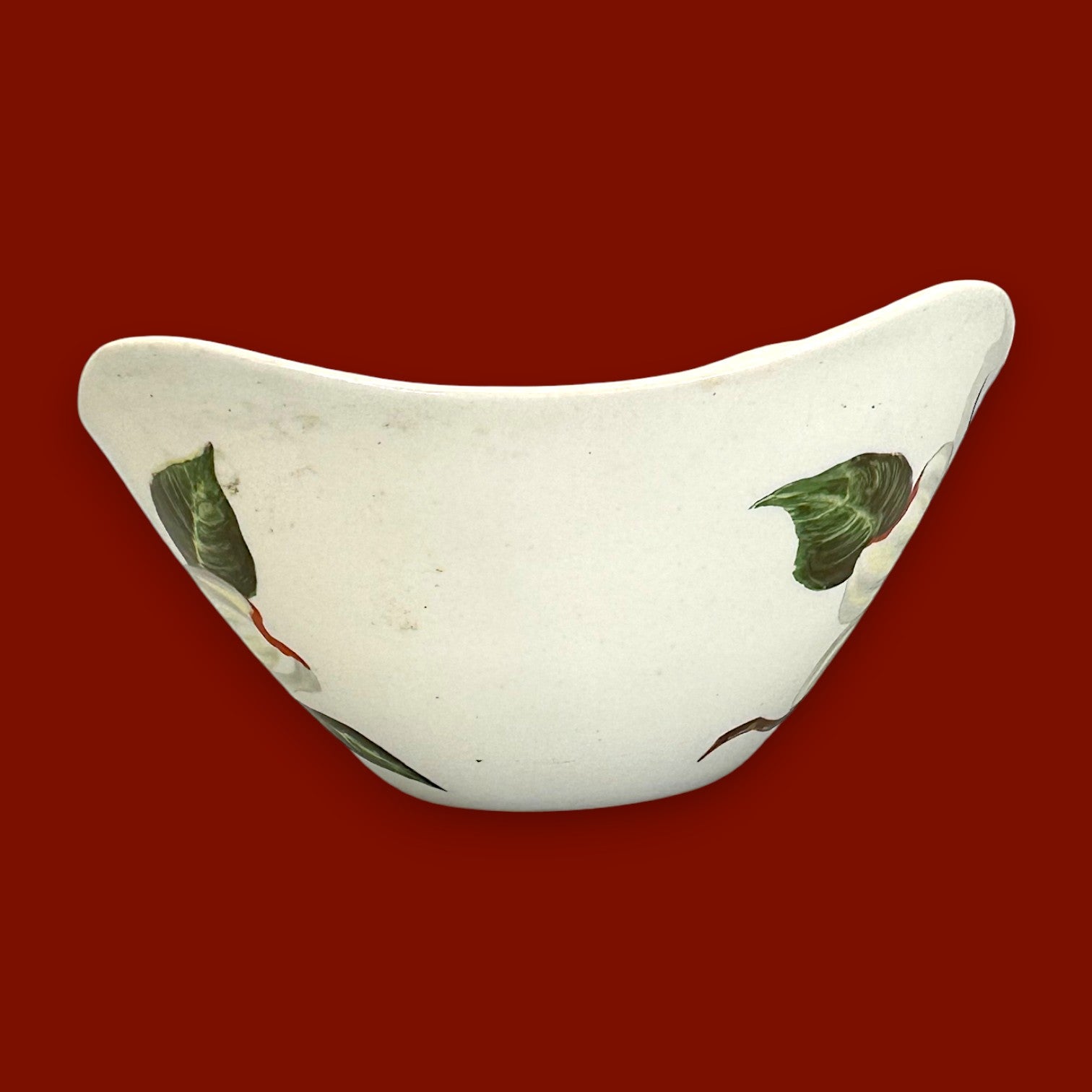 This Midwinter Modern Fashion Shape Bowl is a quintessential piece of 1950s English pottery, crafted in Staffordshire, England. Featuring an elegant organic form and hand-painted floral design, this collectible embodies the charm of post-war British modernism. The soft ivory glaze contrasts beautifully with the natural tones of green leaves and warm orange detailing, creating a harmonious, nature-inspired aesthetic.
